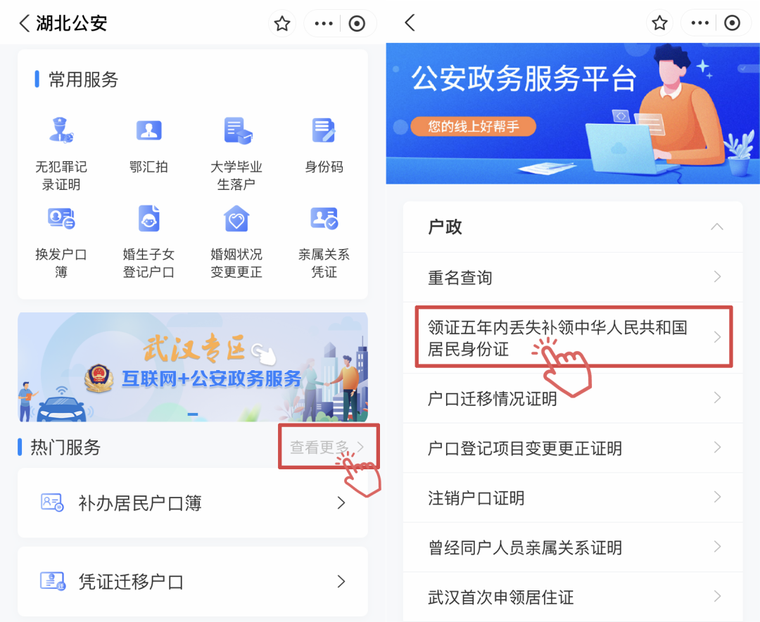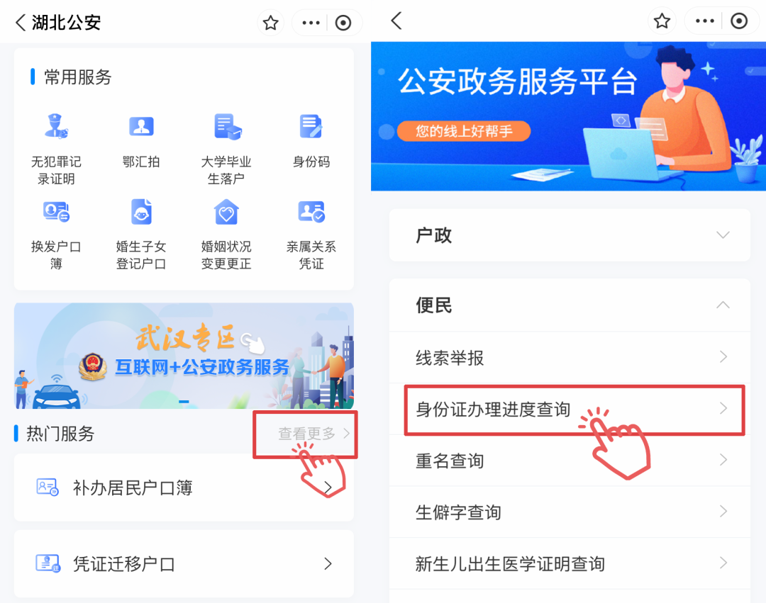 在湖北公安小程序中点击“查看更多”,在便民部分的“身份证办理进度查询”即可查询。