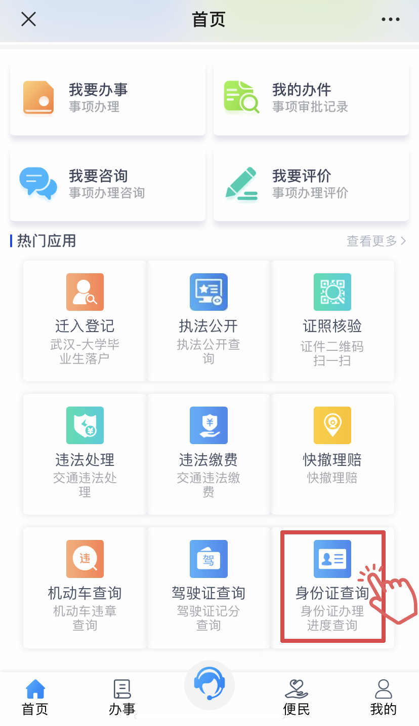 在平台首页的“热门应用”中使用“身份证查询”,输入办理证件的身份证号即可查询。