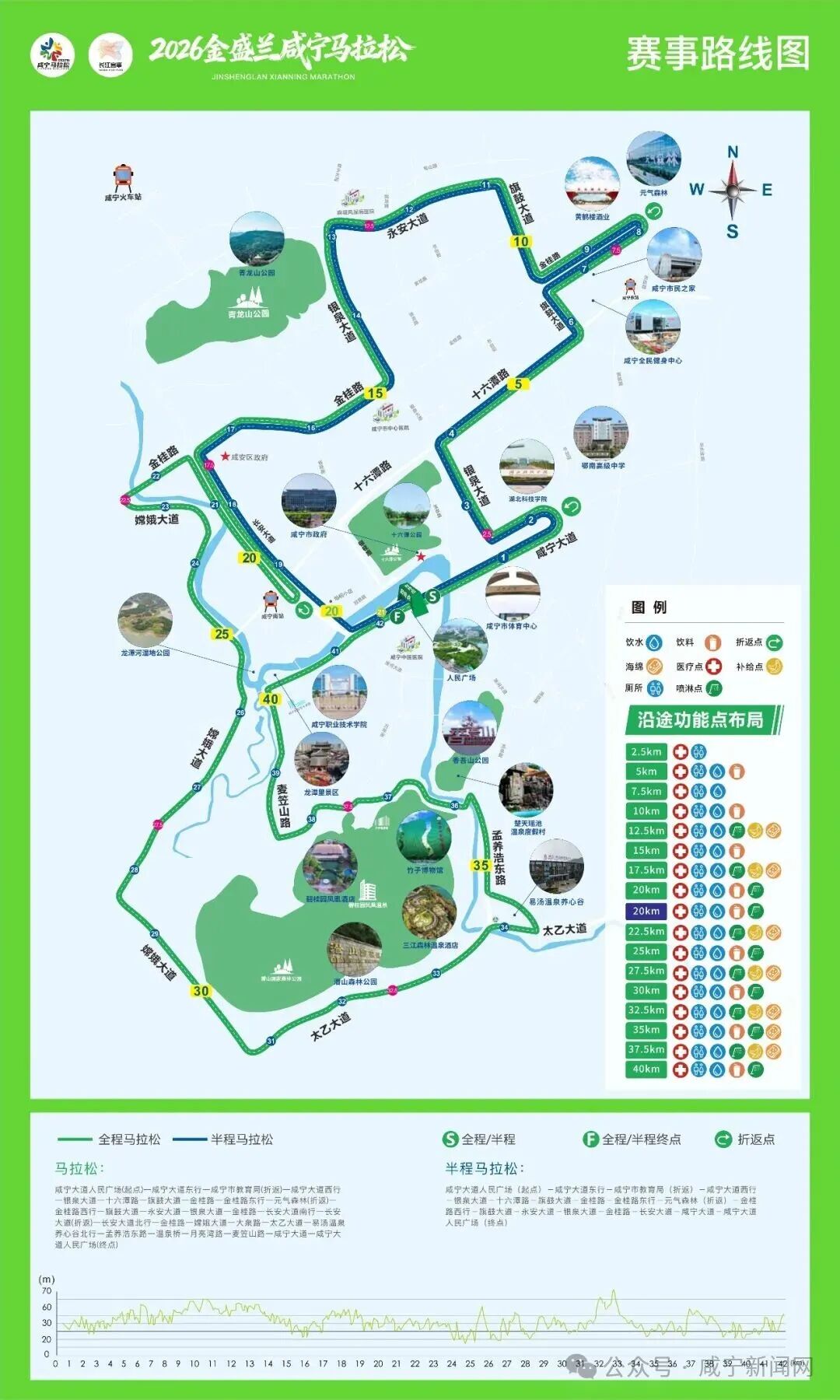 (二)半程马拉松路线(21.0975公里):咸宁大道人民广场(起点)-咸宁大道教育局(折返)-泉塘路口(北行)-银泉大道十六潭路口(东行)-旗鼓大道(北行)-金桂路(东行)-元气森林(折返)-旗鼓大道(北行)-永安大道(西行)-银泉大道(南行)-金桂路(西行)-长安大道(南行)-咸宁大道(东行)-咸宁大道人民广场(终点)。